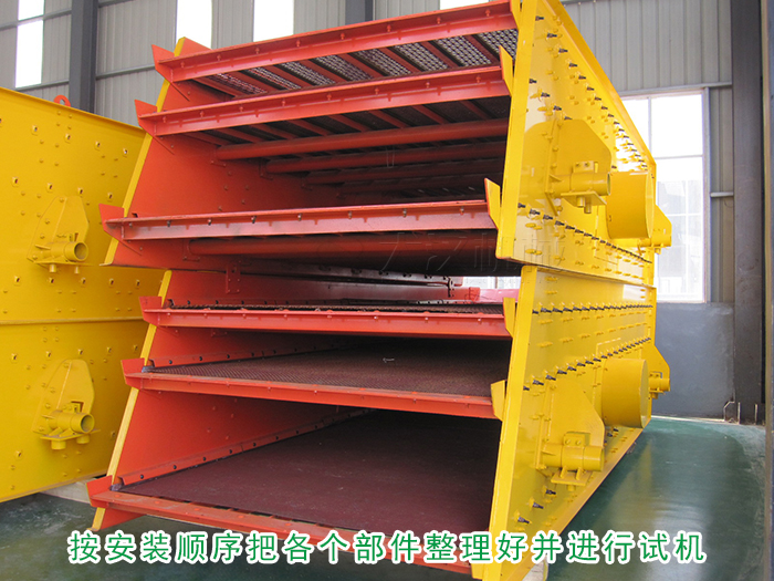 安裝開始時把基礎(chǔ)找平,接著按照支承或吊掛裝置,圓形振動篩的安裝圖,按順序把各個部件整理好,彈簧的裝入可按標記的試機進行選配。