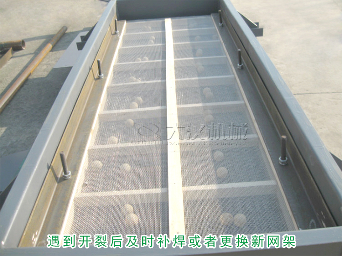 直線振動篩的篩網(wǎng)是由網(wǎng)架固定成型,所以應(yīng)該檢查網(wǎng)架是不是有變形或開裂,遇到開裂后及時補焊或者更換新網(wǎng)架。