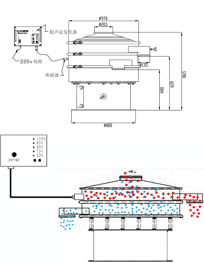 超聲波振動(dòng)篩結(jié)構(gòu)和旋振篩機(jī)構(gòu)相同,只不過(guò)是在旋振篩的基礎(chǔ)上加裝了超聲波振動(dòng)裝置。超聲波振動(dòng)裝置可以使超聲波振動(dòng)篩的篩分效率高出很多。