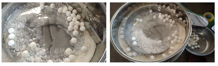 適用物料:塊狀或不規(guī)則物料的表面裹粉,如:湯圓,餃子,花生,雞塊,魚塊等